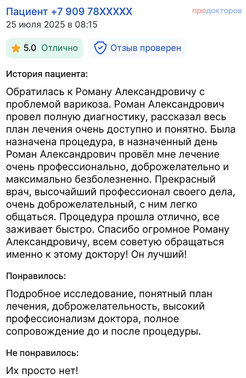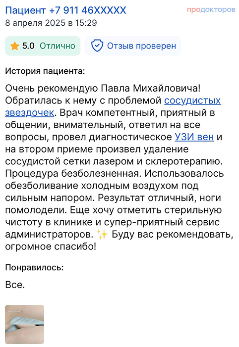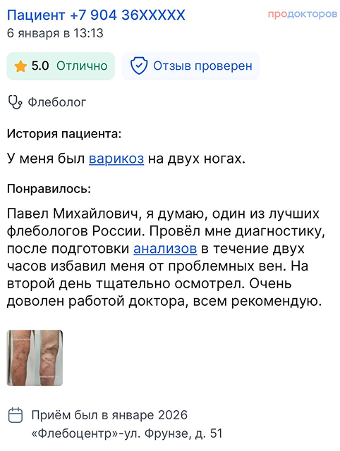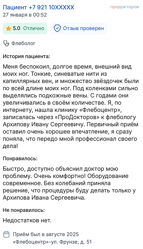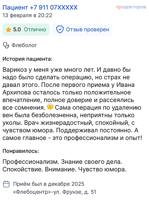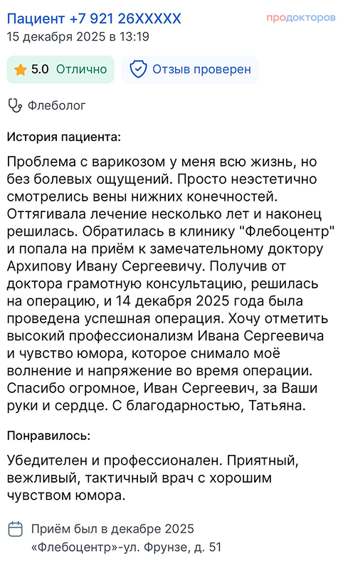 Пациент получает развёрнутые ответы на все вопросы от флеболога (сердечно-сосудистого хирурга)